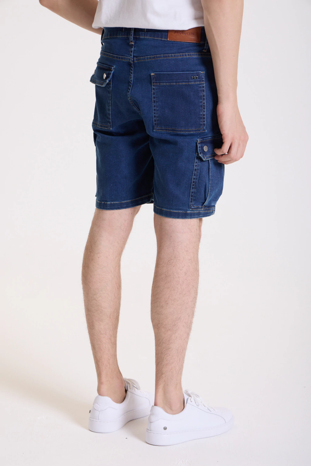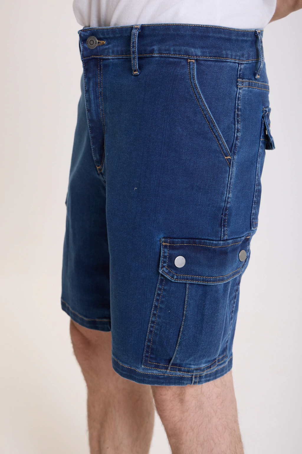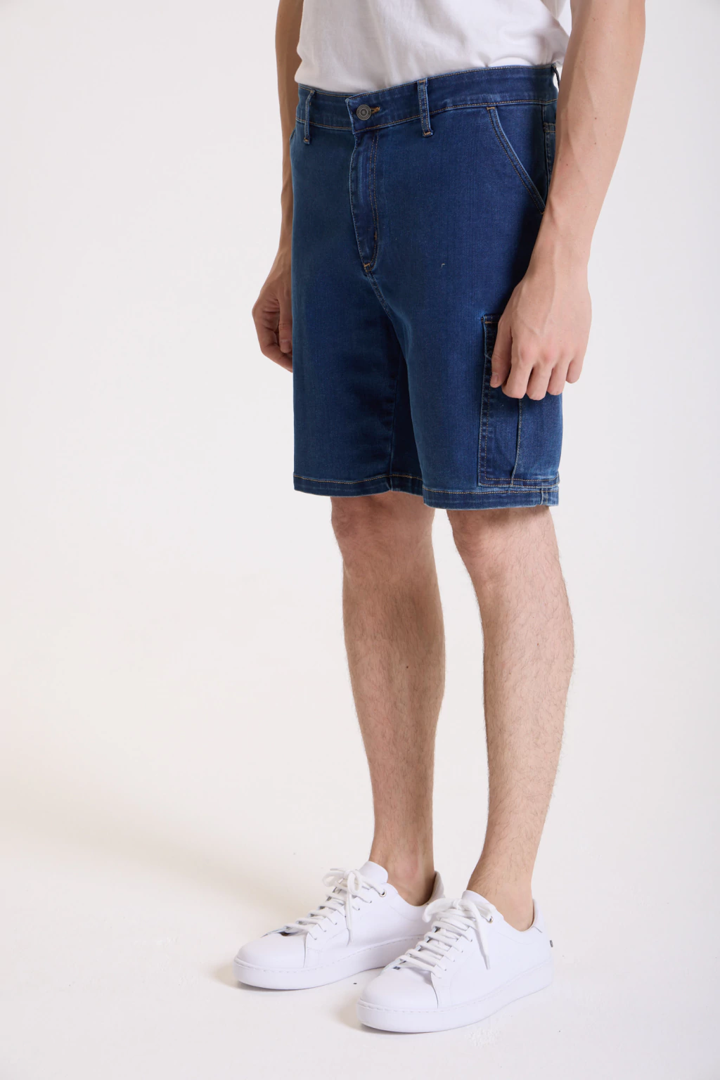 Bermuda confeccionada en denim con 98% algodón y 2% spandex, ideal para el tiempo libre. Presenta un calce regular y diseño tipo cargo en color azul. Incluye bolsillos delanteros tipo americanos, bolsillos cargo en los laterales y bolsillos plaqué con y sin tapa en la parte trasera. Los avíos metálicos en color plata antigua aportan un toque distintivo al diseño.