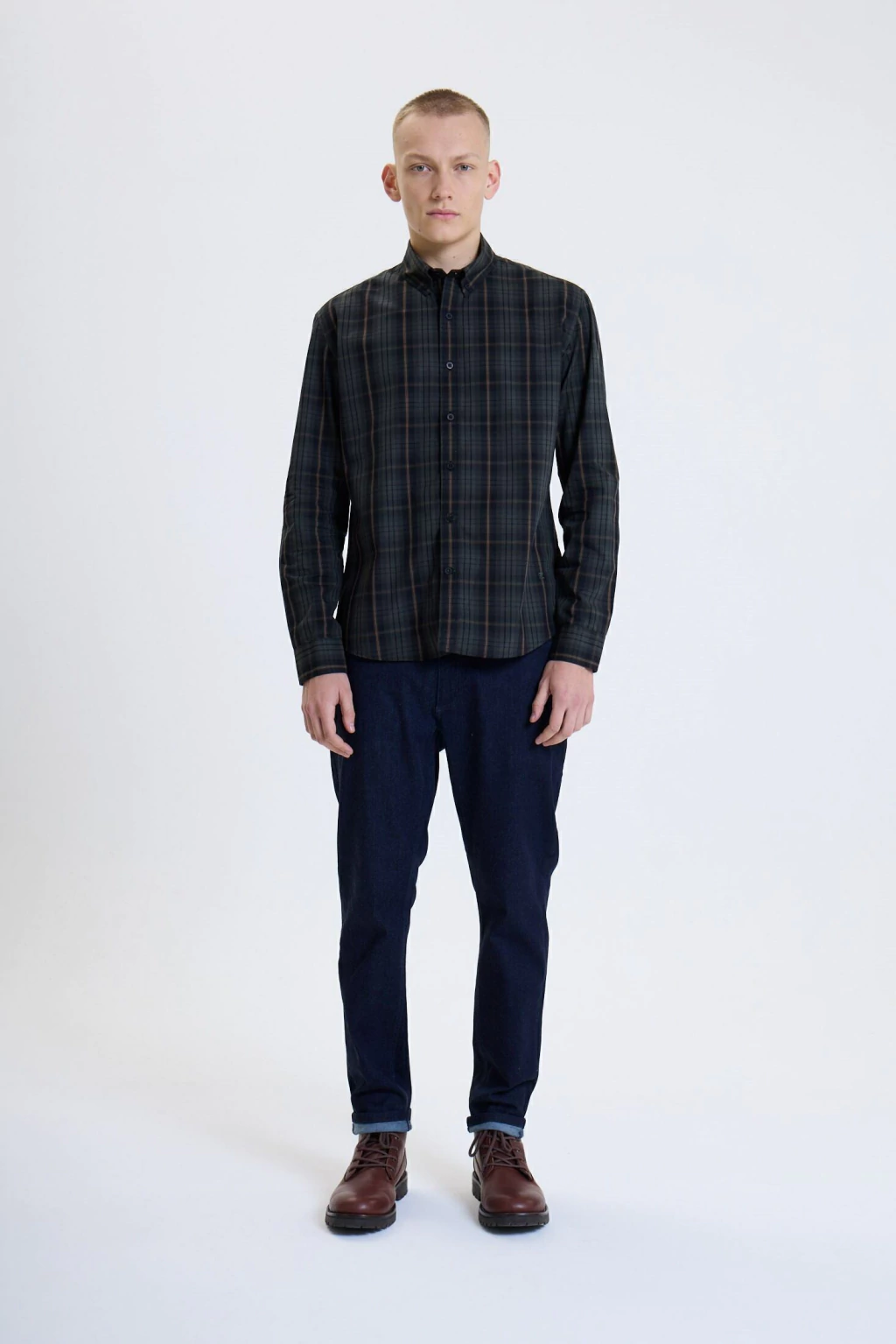 Está confeccionada en 100% algodón, lo que garantiza una textura suave y respirable. Presenta un diseño a cuadros en tono verde militar y detalles funcionales como cuello clásico con botones ocultos (button down) y puños con doble botón para mayor ajuste.