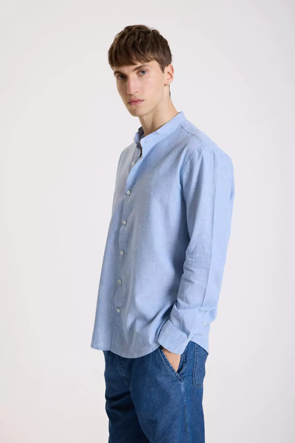 Camisa de manga larga en lino rayado, confeccionada con una mezcla de 55% lino y 45% algodón que aporta frescura y ligereza. Presenta un calce classic, ideal para quienes buscan comodidad con un estilo tradicional. Su diseño incluye cuello Mao, cartera con botones marmolados, y un detalle distintivo de bordado PRT en la cadera. Perfecta para ocasiones casuales, días de tiempo libre o vacaciones, esta prenda combina un look relajado con toques de elegancia natural.