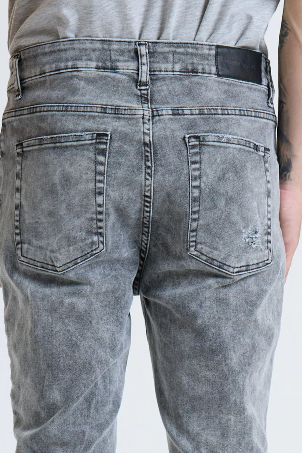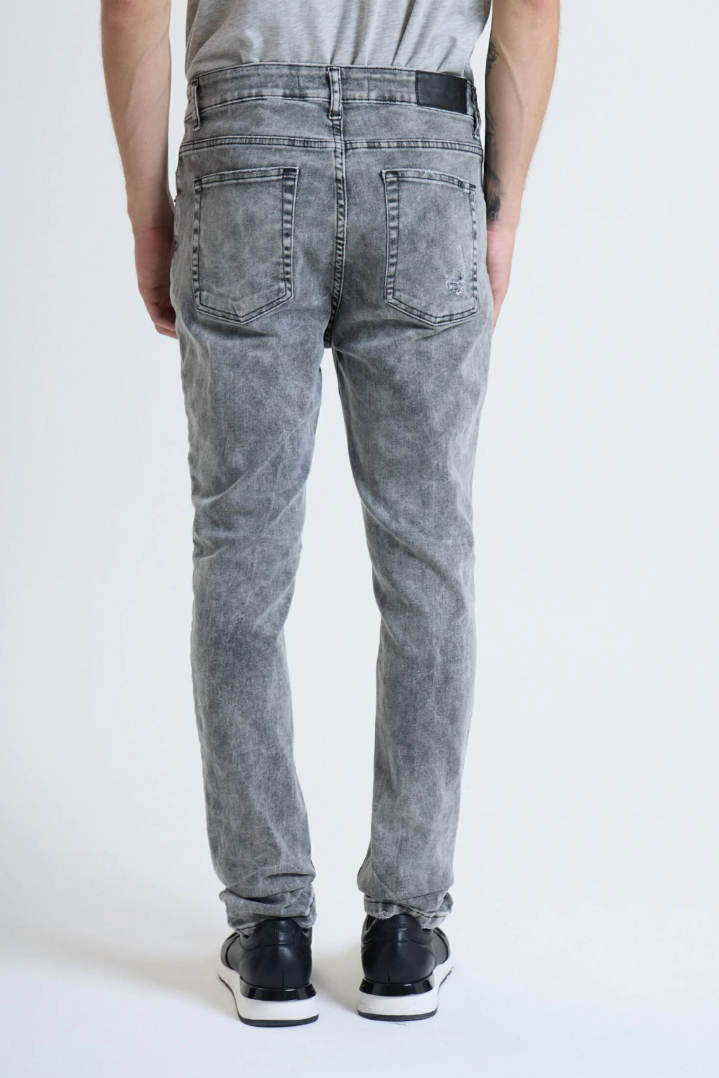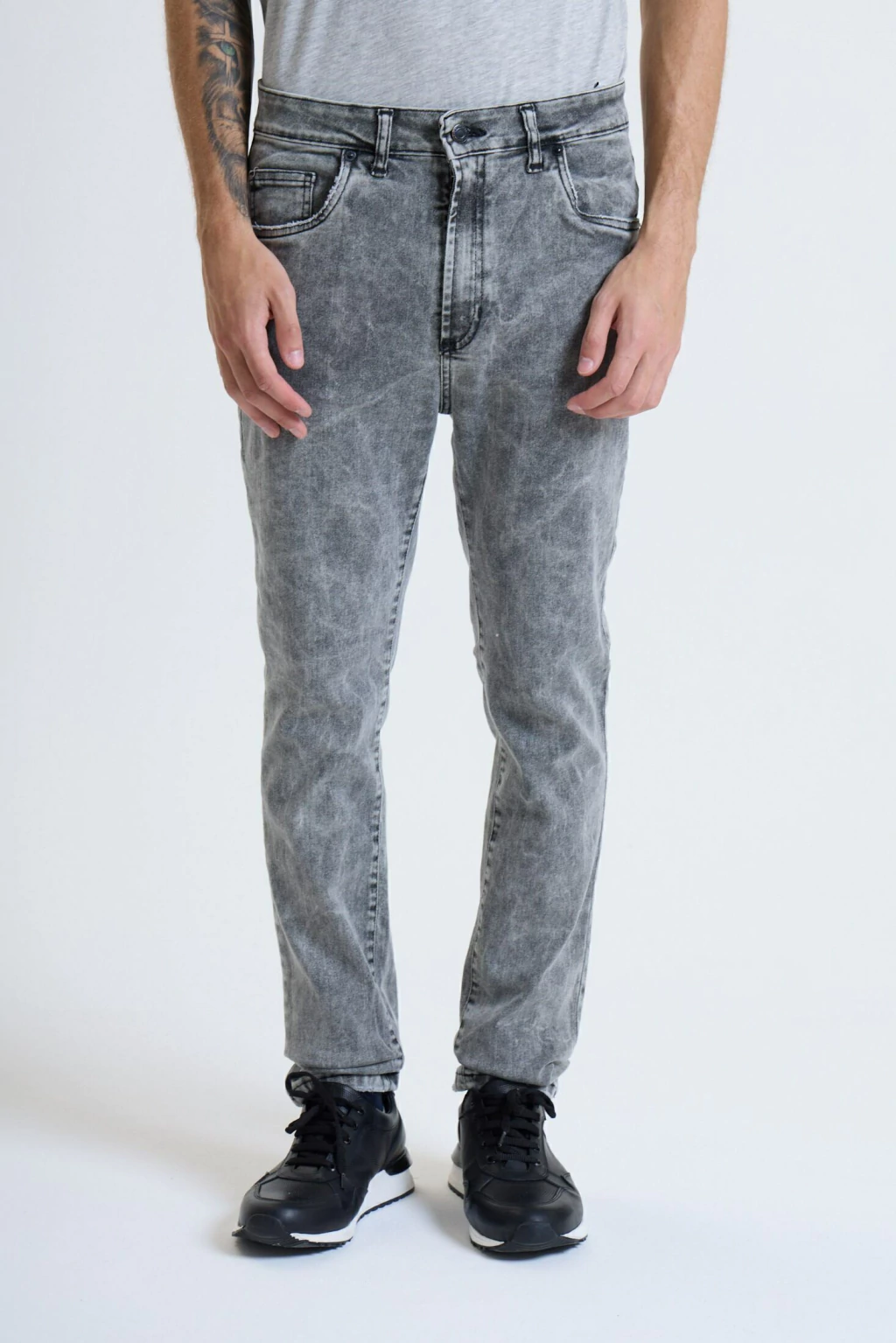 Jean de denim con 98% algodón y 2% spandex, diseñado para uso diario y tiempo libre. Presenta un calce skinny en color gris con lavado stone wash que realza su estilo moderno. Incluye cinco bolsillos y un botón metálico negro en la cintura. Ideal para combinar con la Western Aspen para un look cohesivo.