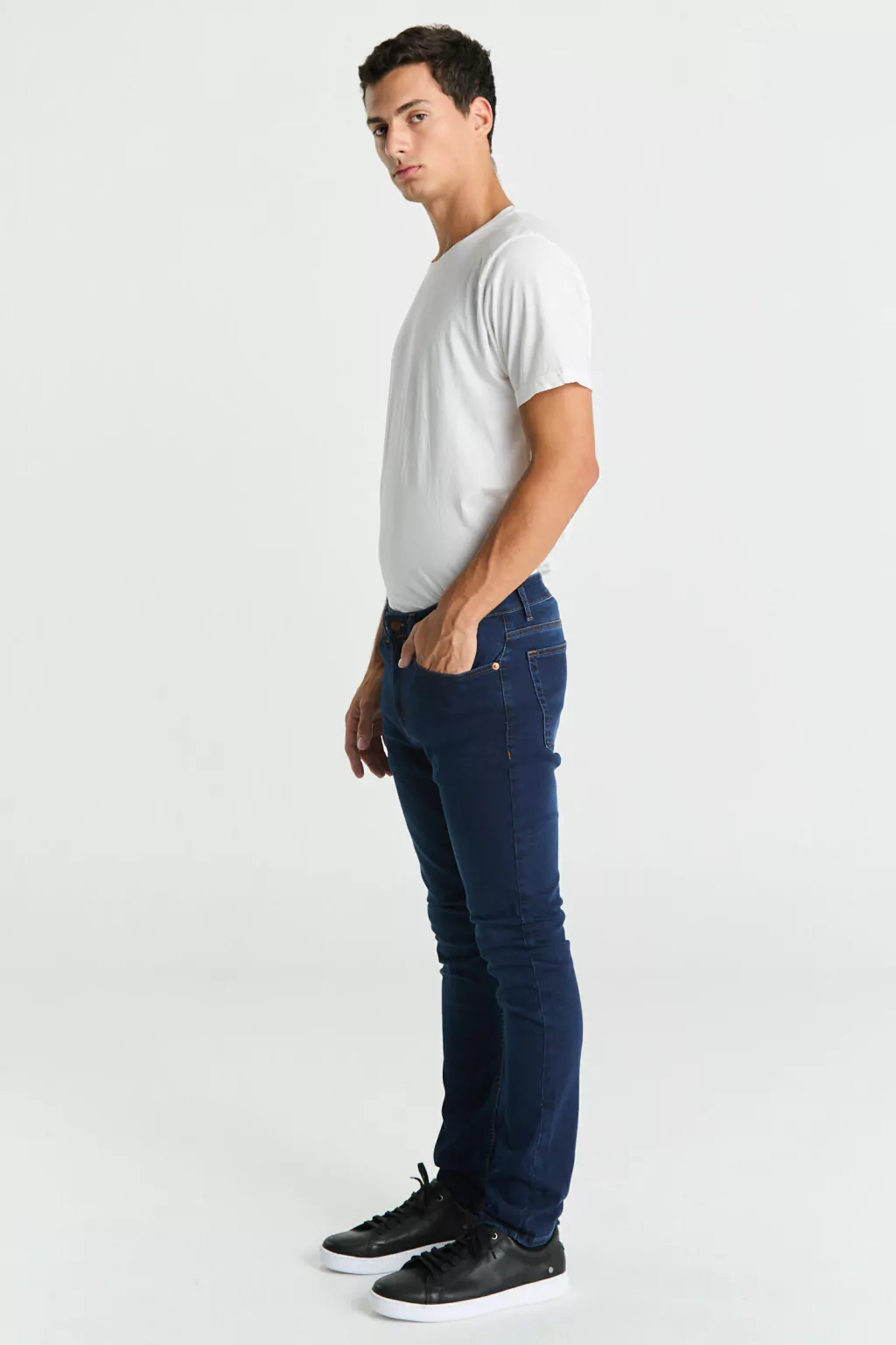 Jean slim fit confeccionado en denim Santista Demi Blue con 98% algodón y 2% spandex, que combina calce entallado y confort elástico. Su diseño de tiro medio con cintura partida, presillas reforzadas y cierre metálico asegura resistencia y practicidad. El lavado azul jean lo convierte en un básico versátil para cualquier ocasión, desde un look urbano con remera y zapatillas hasta un outfit más arreglado con camisa y blazer.