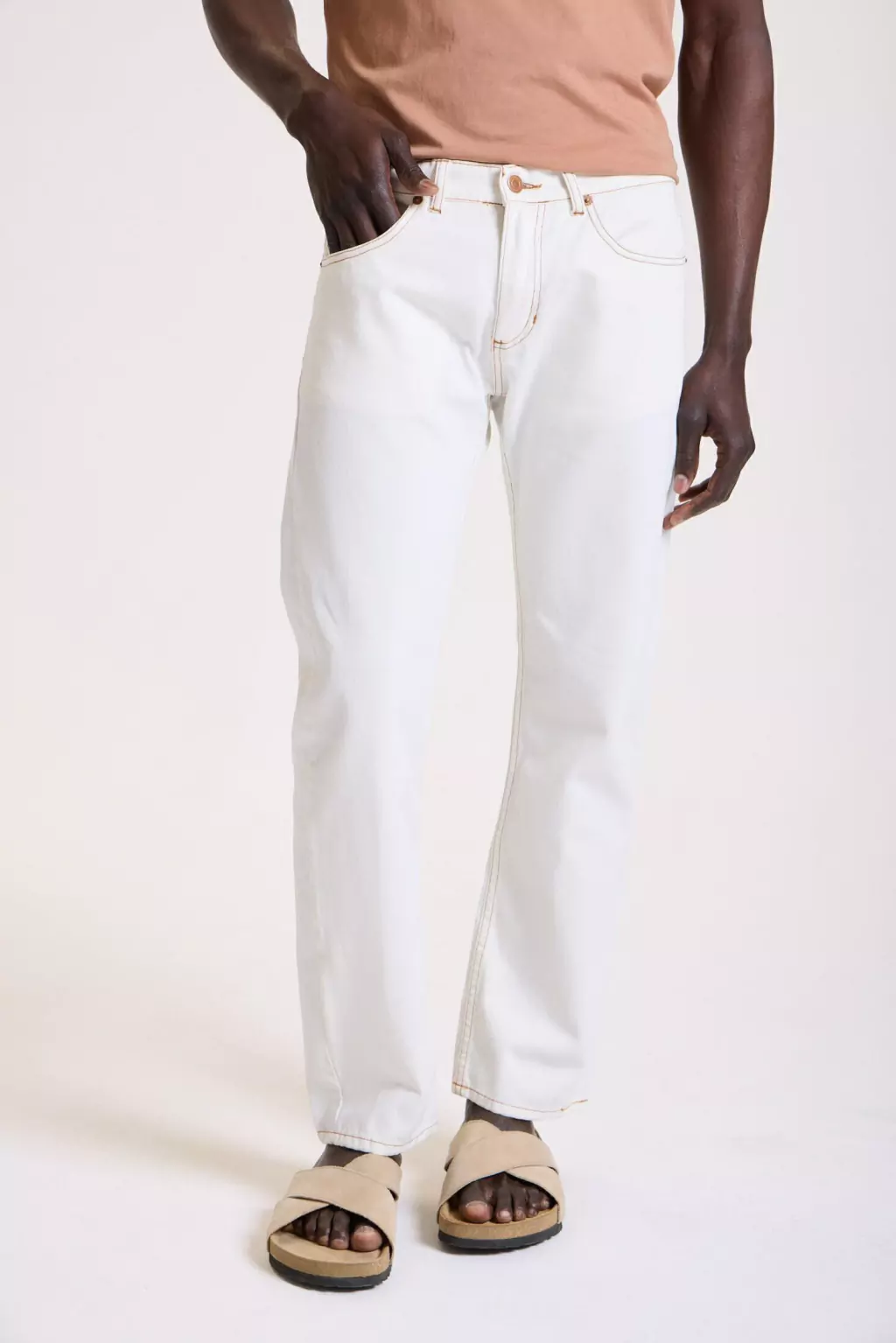 Jean recto confeccionado en gabardina de 8 oz y 100% algodón, en un elegante color blanco. Su diseño incluye cinco bolsillos, avíos metálicos en color cobre y un detalle de bordado "GOOD" en color crudo sobre el bolsillo trasero. Este modelo se combina perfectamente con la campera Western Relax Good para un conjunto total white, ideal para un look diario moderno y sofisticado.
