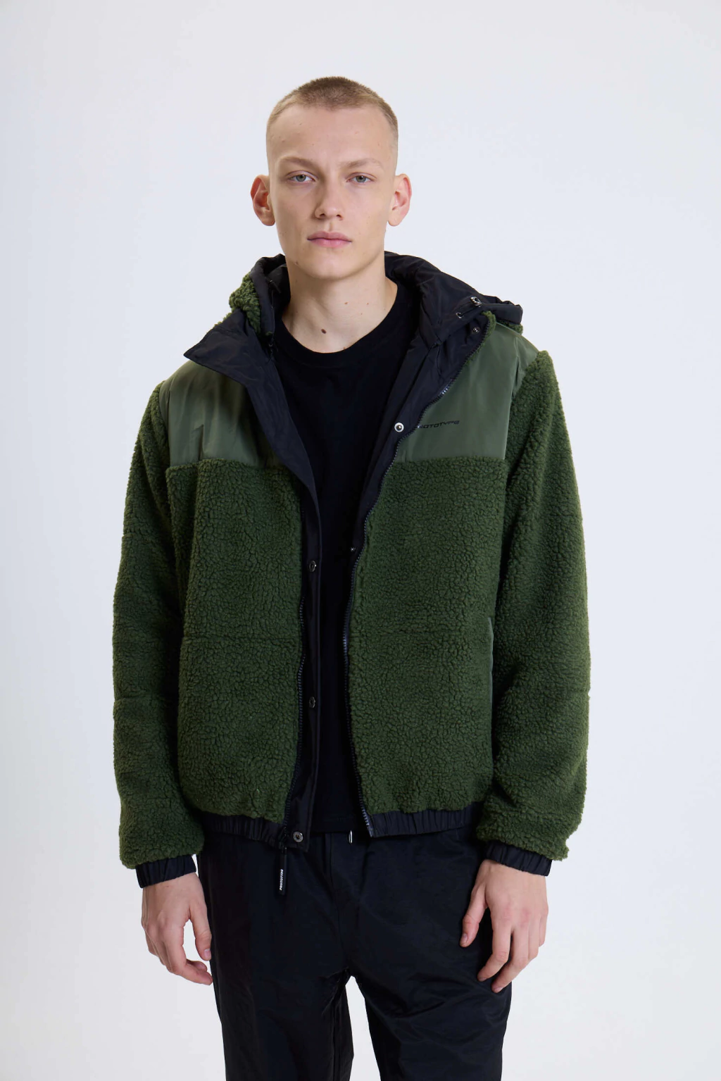 Su diseño incluye capucha desmontable, cierres ocultos reversibles con solapa interna, y elásticos internos en puños y cintura para mejor ajuste. El cuello alto con tapa de solapa ayuda a proteger del viento, mientras que el interior de la capucha forrado en sherpa aporta suavidad y confort.