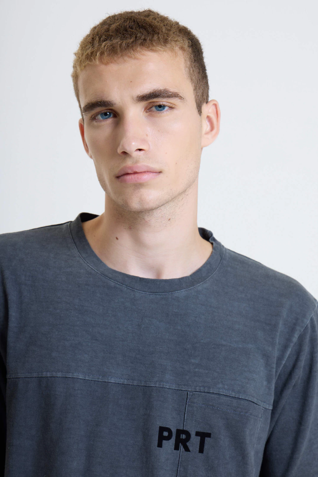 Incorpora detalles que suman estilo y terminaciones de calidad: bolsillo frontal con estampa tipo flock (una técnica con relieve suave), cuello con terminación reforzada y costuras al tono, y cinta interna de hombro a hombro para mayor durabilidad. Su tejido tipo jersey vintage brinda una caída relajada y textura suave al tacto.