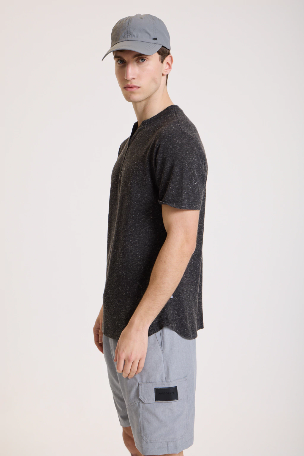 Remera de manga corta confeccionada en lino de punto (90% poliéster y 10% lino), ideal para el uso diario. Presenta un diseño contemporáneo con medio cuello y cierre de nylon a tono en el área del cuello y pecho. Perfecta para un look casual con un toque moderno.
