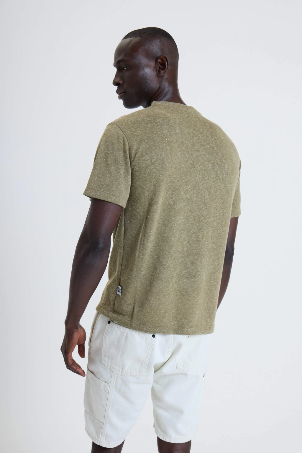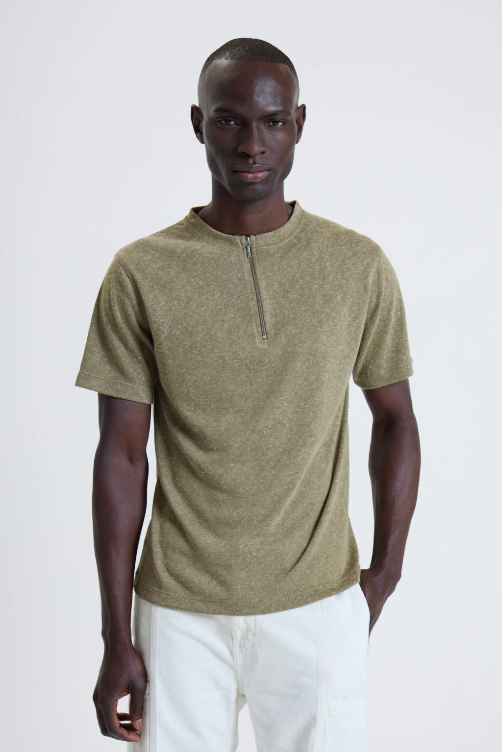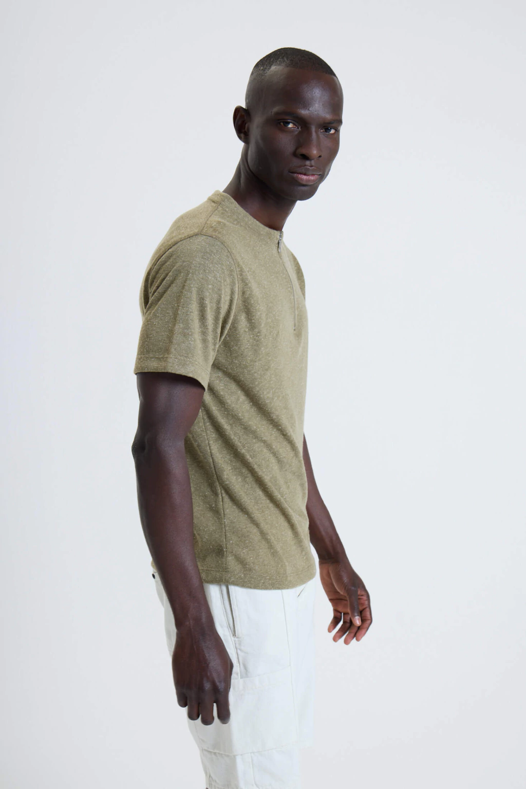 Remera de manga corta confeccionada en lino de punto (90% poliéster y 10% lino), ideal para el uso diario. Presenta un diseño contemporáneo con medio cuello y cierre de nylon a tono en el área del cuello y pecho. Perfecta para un look casual con un toque moderno.