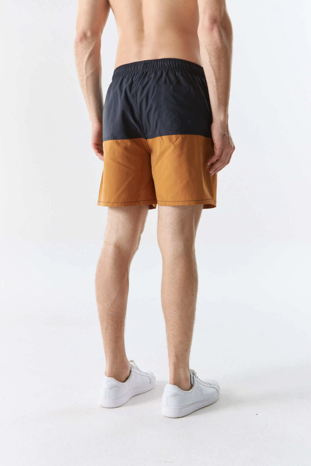 Traje de baño de taslon liso, 100% nylon. Lleva cordón de ajuste en cintura y gomita PVC de marca con logo línea Hawaii. Tiene dos bolsillos laterales y uno trasero con cierre de velcro y detalle de ojalillo. Diseño bicolor en dos combinaciones: negro/naranja y azul indigo/lila.