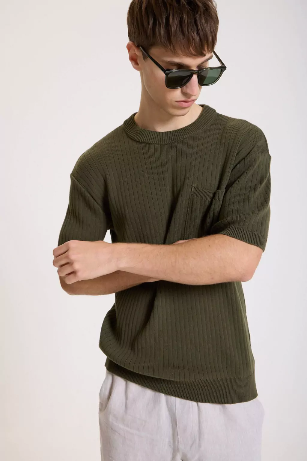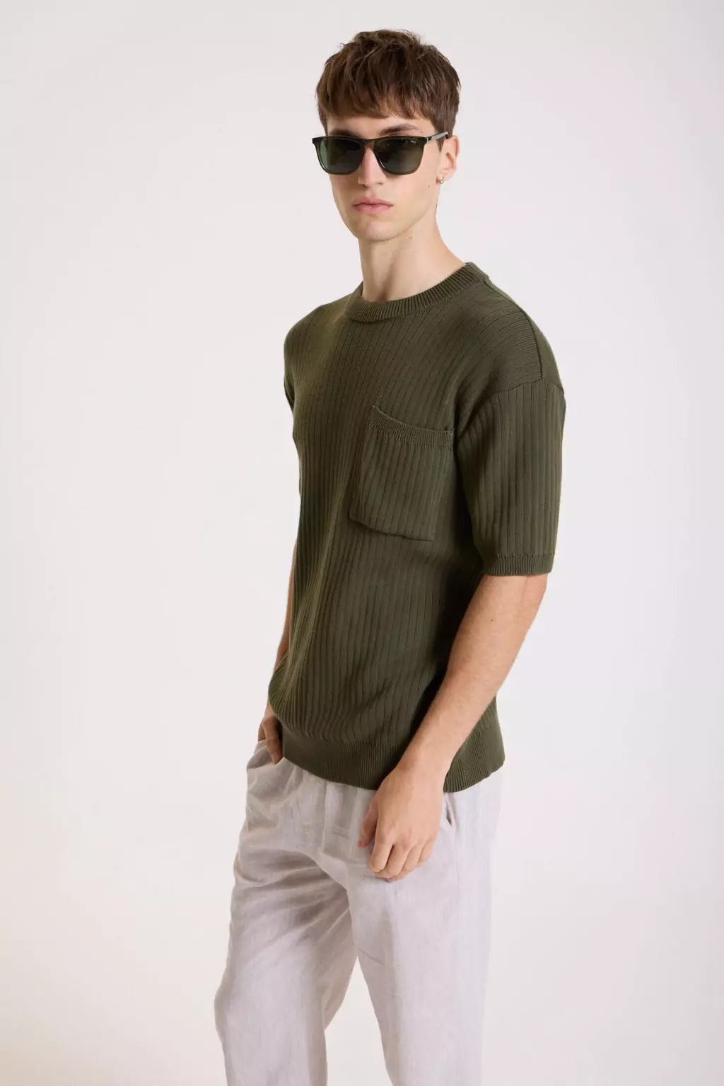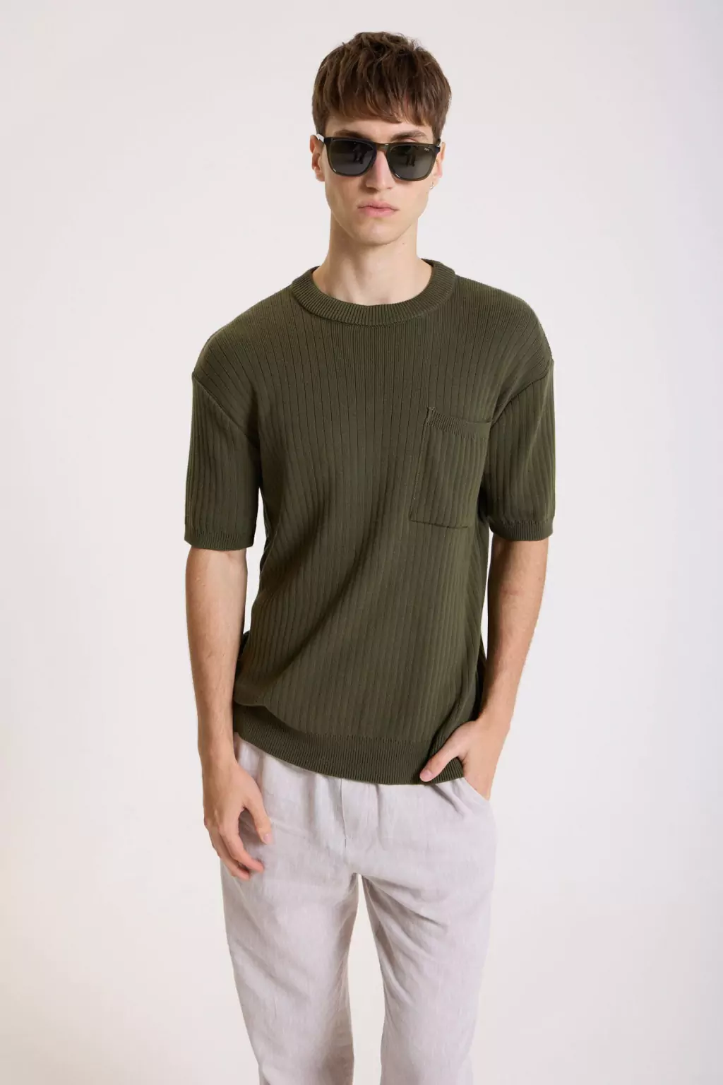 Este sweater manga corta está confeccionado en tejido de canaletas verticales 100% algodón, ofreciendo una textura cómoda y elegante. Incluye un bolsillo plaqué en el pecho, decorado con un avío metálico personalizado que le da un toque distintivo. Los puños de las mangas y la cintura presentan un acabado de punto acanalado que aporta estructura y estilo al diseño. Perfecto para ocasiones de estilo elegante sport, combinando versatilidad y elegancia en una prenda ideal para el día a día.